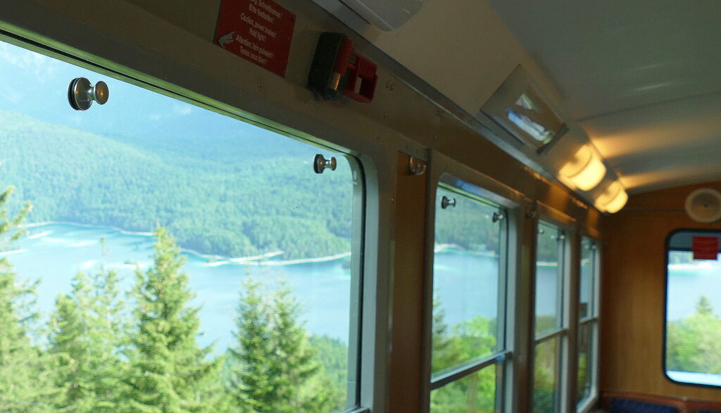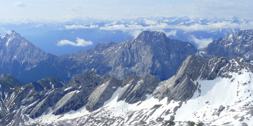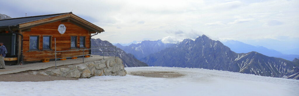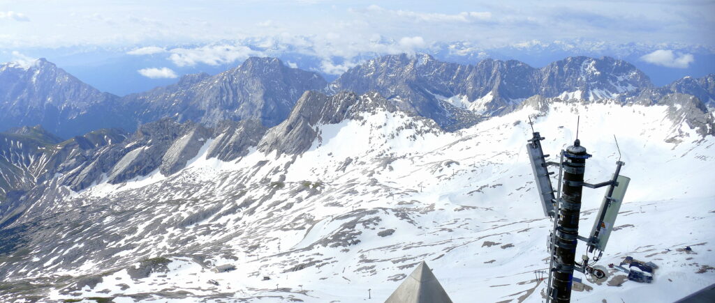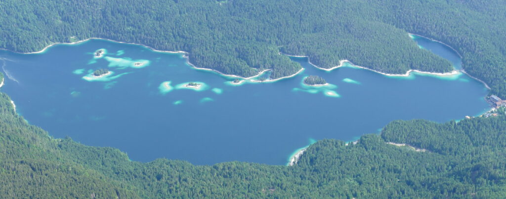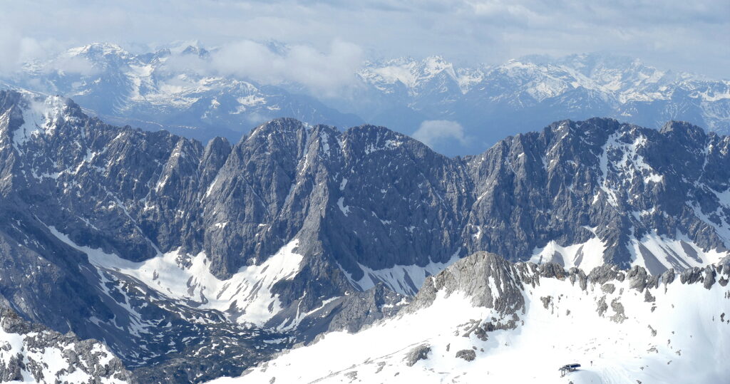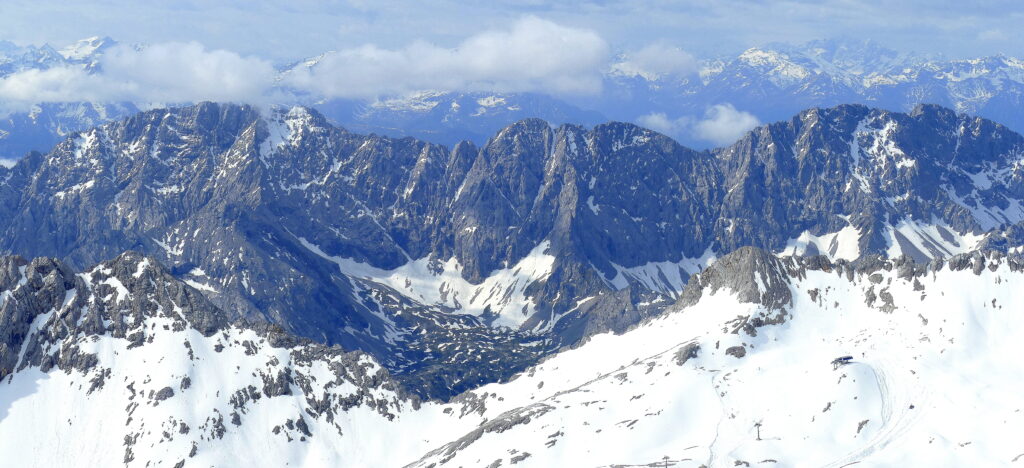 Ich bin fasziniert von der Technik und wie man die Gebäude am Berg befestigt hat. Die Plattformen sind spärlich besucht und werden wegen des Windes auch schnell wieder verlassen. Die Fernsicht ist nicht ganz so gut, wie mein erster Eindruck war. Ich kann sehr weit sehen, dazwischen einige Wolken. Tief im Tal ein Blick auf den Eibsee. Jetzt kann ich mir gut vorstellen, wohin der Bergsturz seine Massen verteilt hat. Nachdem ich in alle Richtungen geschaut hatte, wollte ich mich an einem Kaffee aufwärmen.