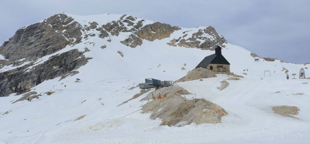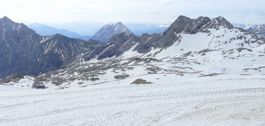 Alle Mitreisenden, vielleicht 10-12 Leute, fuhren gleich weiter. So stapfte ich ganz allein auf dem sterbenden Gletscher herum. Die Gastronomie, die auch auf dieser Ebene vorhanden war, war noch geschlossen. Auf dem Schneeferner, der sich in den Nördlichen- und Südlichen Schneeferner aufteilt, wird Wintersport betrieben. Seit 1955 wurden 5 Liftanlagen auf der Eisfläche errichtet. Für mich ist eine Kommerzialisierung, die so weit geht, eine unangenehme Vorstellung. Ehemals 300 ha groß, ist bis zum Jahr 2018 nur noch 18 ha übergeblieben. Ca. 10% davon fallen noch auf den Südlichen Schneeferner. Ihm hat man den Status Gletscher aberkannt, da er sich nicht mehr bewegt und weiter abschmilzt. Auch der Nördliche Schneeferner wird, so sagt es der Bayrische Gletscherbericht des Jahres 2021, in wenigen Jahren verschwunden sein. Auch der Nördliche Schneeferner soll nur noch eine Dicke von 20 m haben und 13 Hektar groß sein. Das Schmelzwasser versickert in der verkasteten Hochfläche und tritt im Reintal wieder an die Oberfläche. Hier werden die Flüsse Partnach, Loisach, Isar und Donau gespeist. Die Gletscher liegen frei von Bergschatten in der Sonne, der Schnee hat eine etwas dunklere Farbe angenommen und nimmt die Sonnenenergie dadurch stärker auf. Die durch den Klimawandel veränderten Umweltbedingungen arbeiten weiter an der Schneeschmelze. Der Gletscher wird in den Sommermonaten mit Planen abgedeckt. Das hilft nicht wirklich, der Erfolg liegt bei 1%, außerdem schüttet man Schnee von anderen Stellen hier auf.