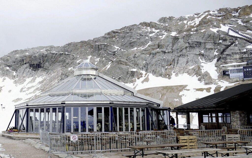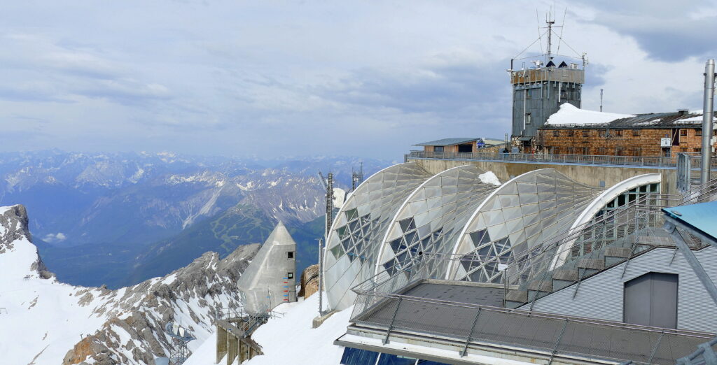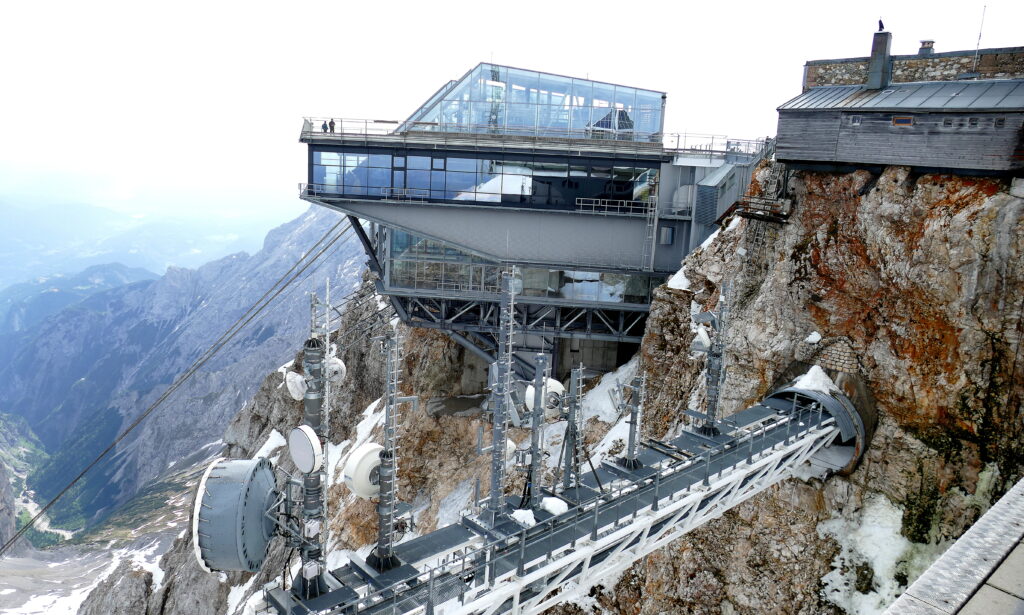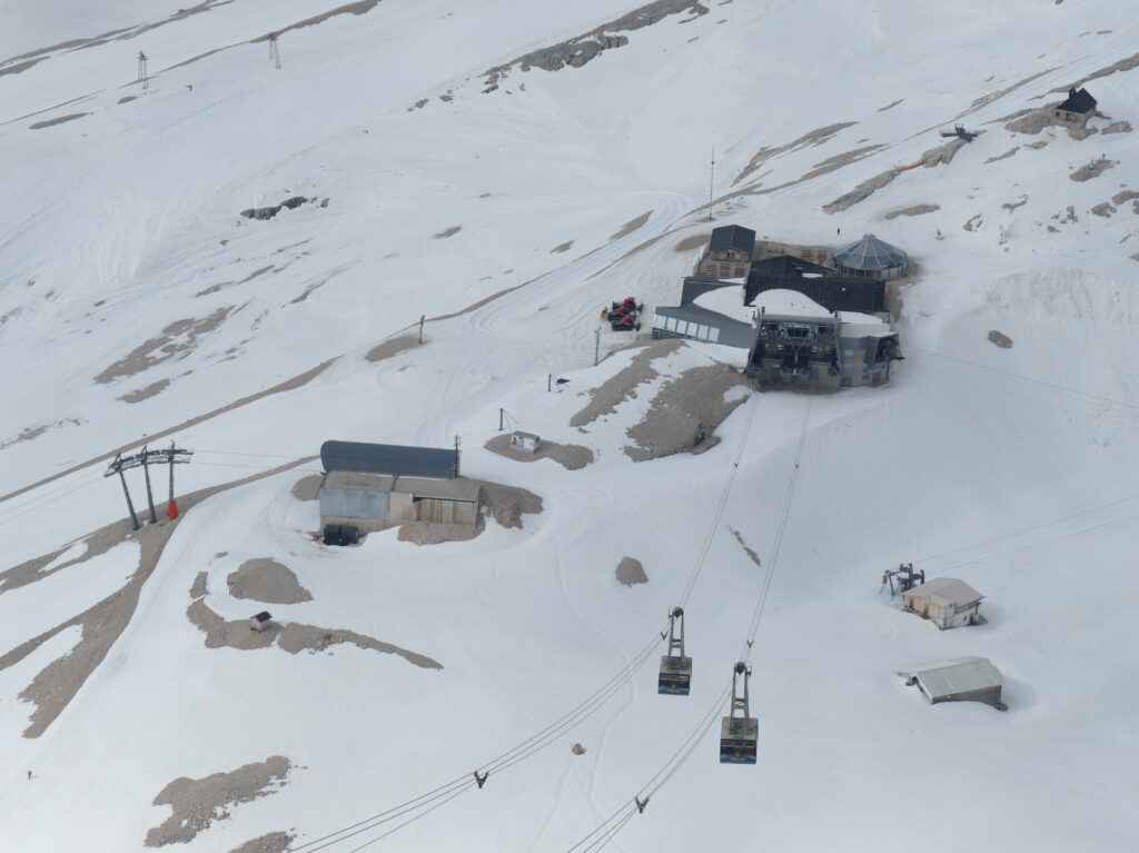 Die Seilbahn schwebt über das Schneeferner Haus nach oben. Früher war das ein Hotel, seit 1999 wird es als Umweltforschungsstation genutzt. Inzwischen gibt es auch Führungen über den Gletscher. Dort wird den Touristen der Zusammenhang zwischen Klimawandel und Schneeschmelze erklärt.
