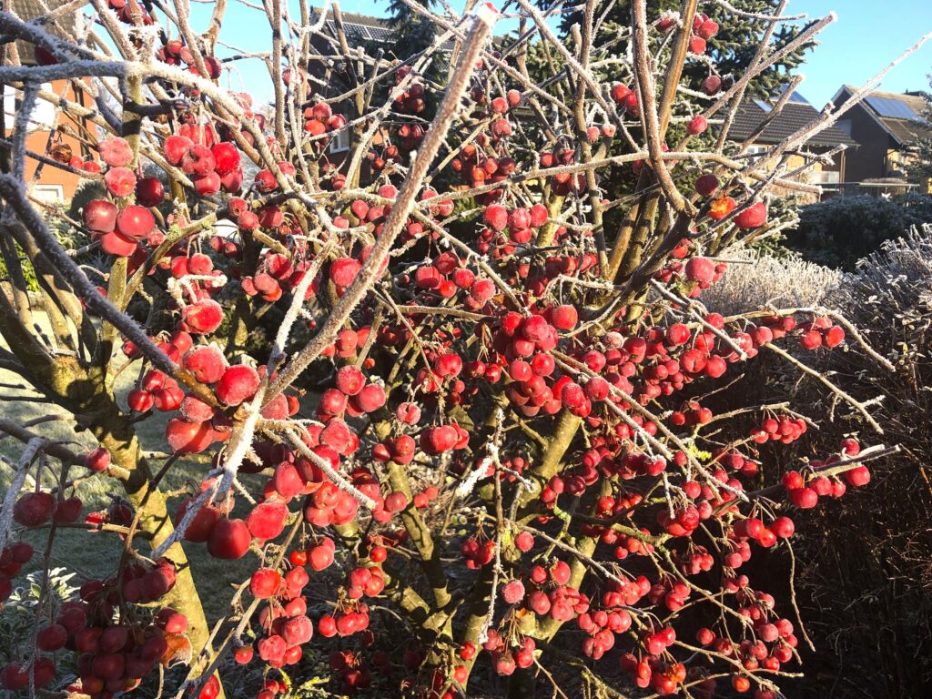 Bis in den Winter hinein halten sich die kleinen Äpfel des Zierapfels (Malus) und bieten Wintervögeln eine willkommene, vitaminreiche Mahlzeit.