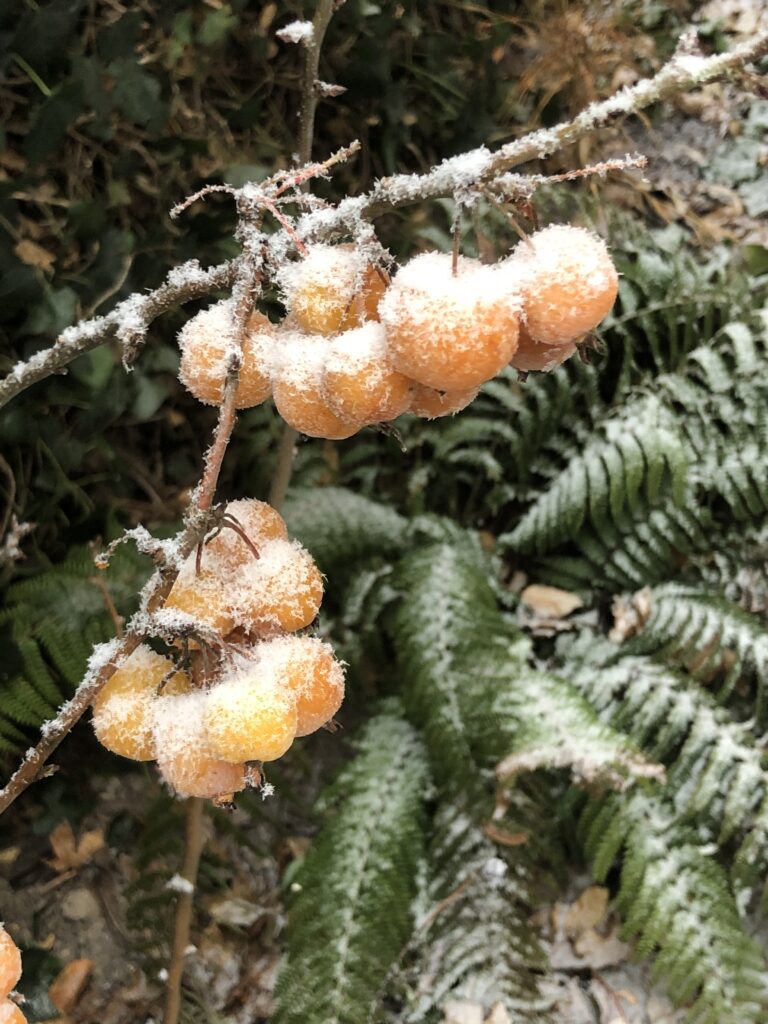 Bis in den Winter hinein halten sich die kleinen Äpfel des Zierapfels (Malus) und bieten