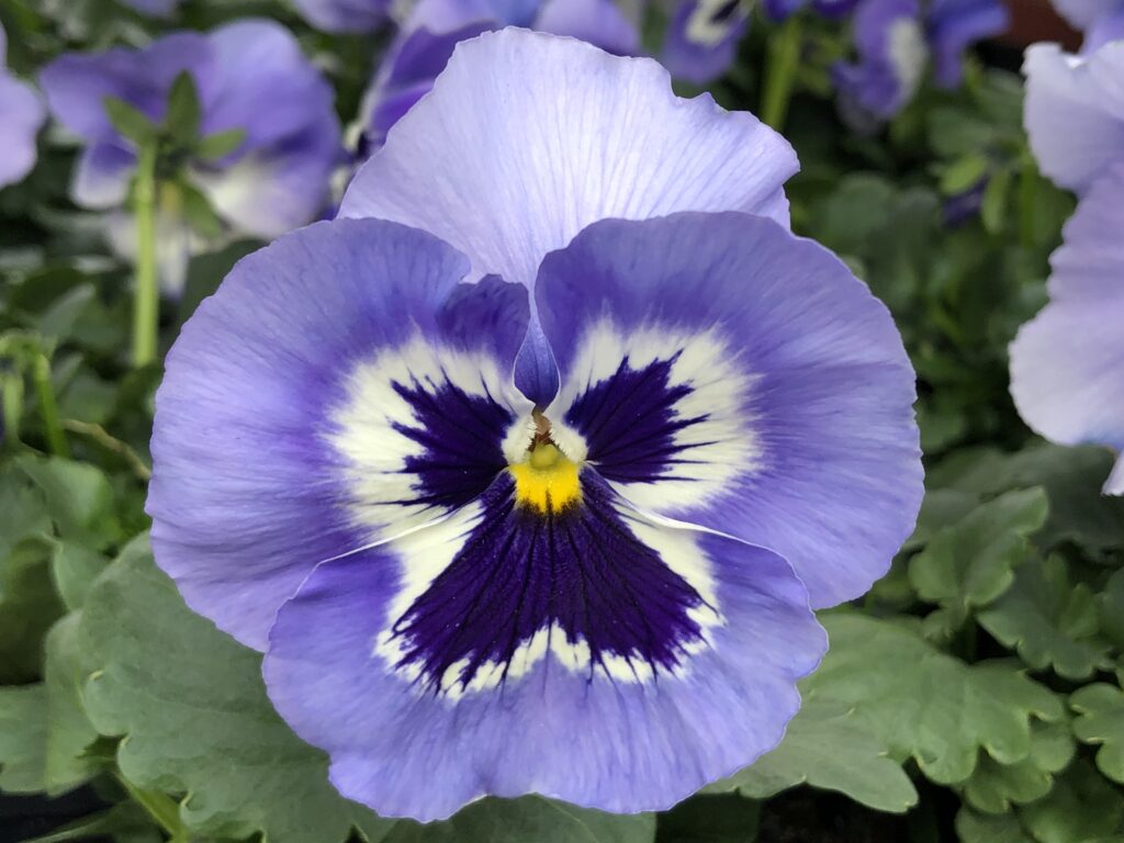 Auch die großblütigen Stiefmütterchen sind in den verschiedensten Farben und Mustern erhältlich, es gibt Sorten mit und ohne Auge. Die besondere Anordnung der Blütenblätter verhalf dem Stiefmütterchen zu seinem Namen: das größte, untere Kronblatt ist die „Stiefmutter“, die beiden danebenstehenden sind die „Töchter“ und die beiden oberhalbstehenden Blütenblätter sind die „Stieftöchter“.