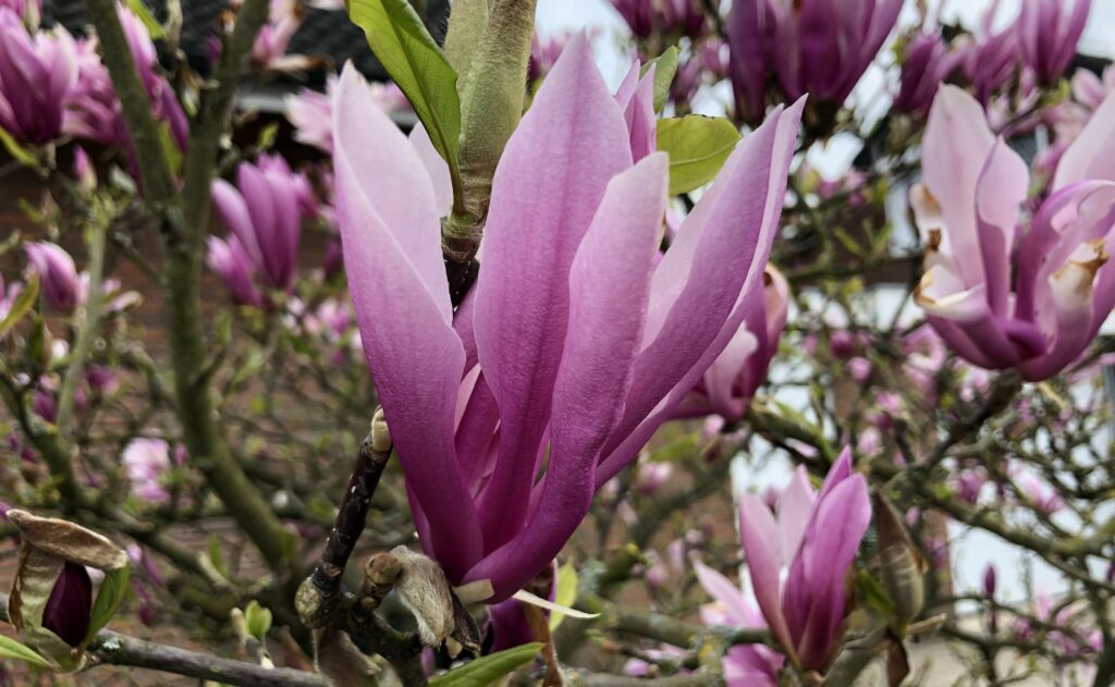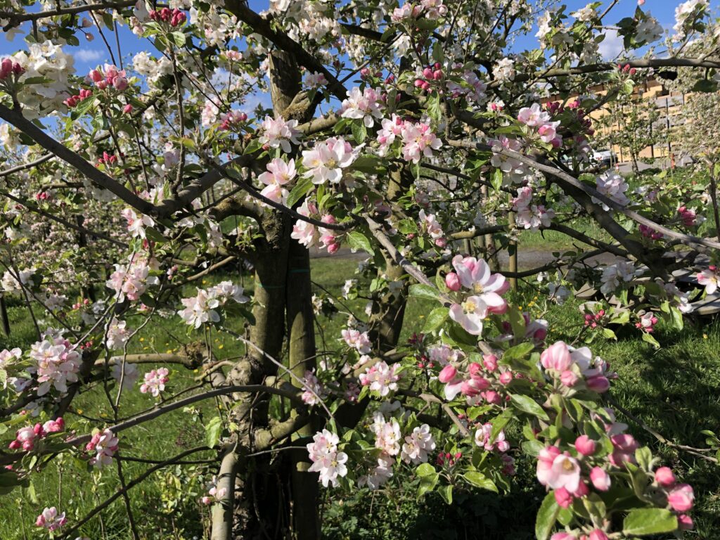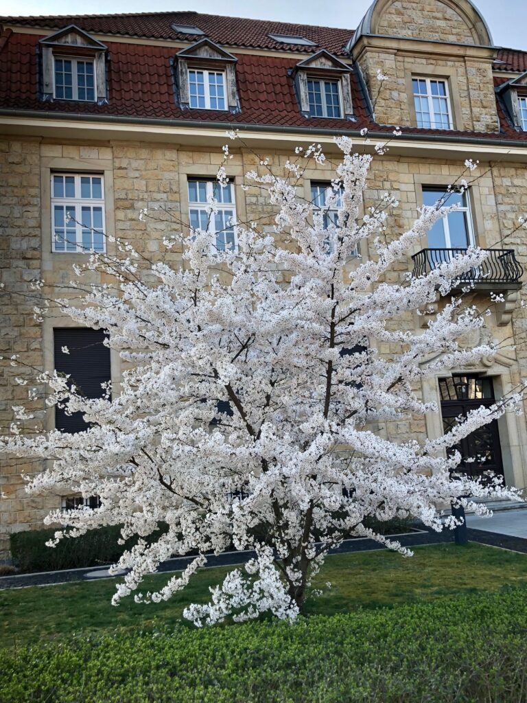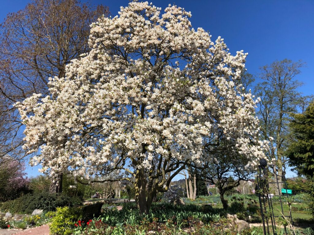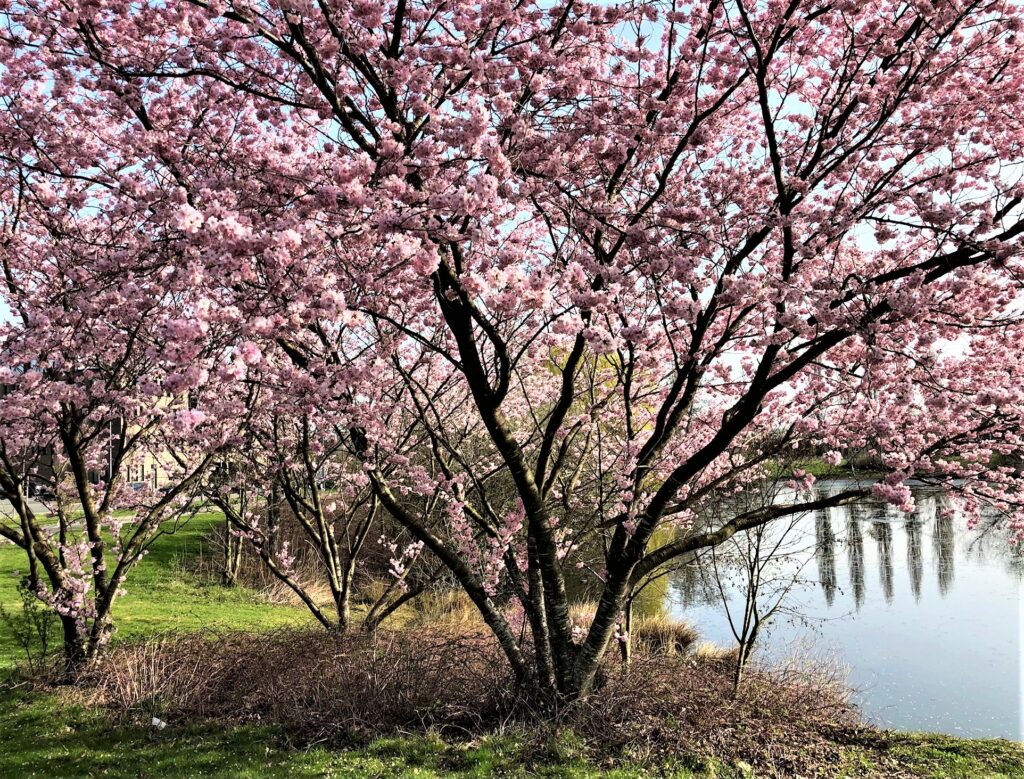 Ab April blühen viele Zier – und Nutzbäume bzw. Sträucher. Zierjohannisbeeren mit dunkelrosa Blütentrauben, Mandelbäumchen in zartrosa, die Forsythien mit leuchtendgelber Blütenpracht, die Tulpenmagnolien in rosa – roter Fülle, die strahlendweißen Blüten der Zierpflaume, die wolkenartig in Dolden zusammensitzen. Ebenfalls weißblühend die zahlreichen traubenartigen Blütenstände der Felsenbirne und natürlichdie rosarote Pracht der japanischen Zierkirsche (Prunus serrulata), die in Japan, dem Ursprungsort der Pflanze, mit zahlreichen Festen zum Frühlingsbeginn gefeiert wird.
