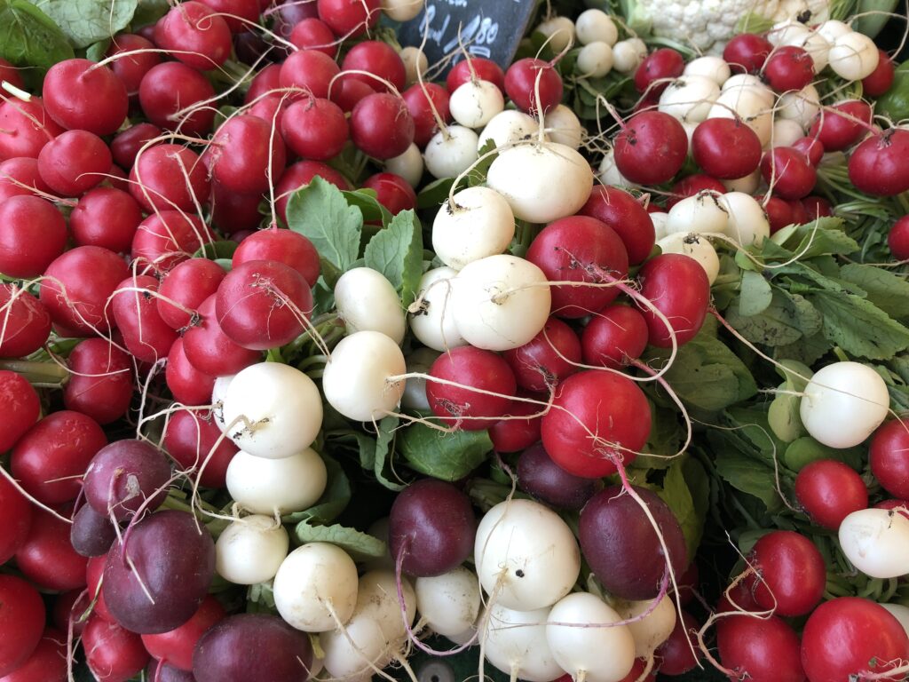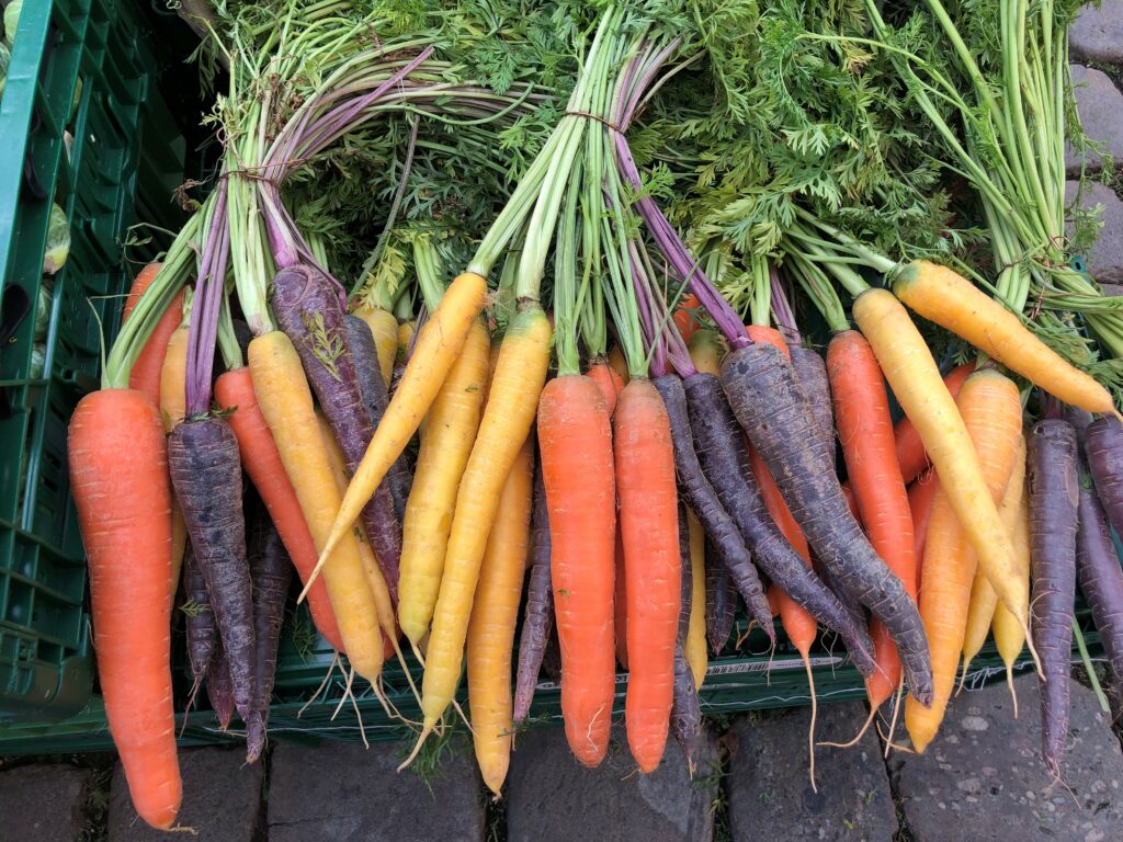 Die meisten Gemüsearten werden in Reihen gesät, der Reihenabstand und der Abstand in der Reihe hängen von der Größe der ausgewachsenen Pflanzen ab. Auch die Aussaattiefe variiert, größere Arten wie Erbsen legt man tiefer, kleinere wie Radies, Rettich, Zwiebeln, Spinat, Rote Beete, Pastinaken oder Möhrensamen flacher. Faustregel: etwa doppelt so dick mit Erde bedecken, wie das Samenkorn dick ist. Und bei entsprechender „guter Pflege“ kann man dann zum Beispiel im Frühsommer solch bunte Möhren oder Radieschen Exemplare ernten!
