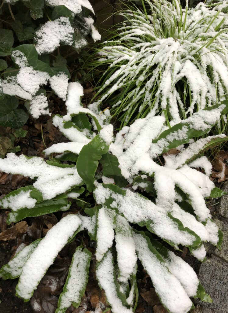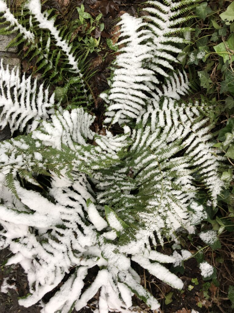 Besonders fotogen sind auch wintergrüne bis immergrüne Farne, die mit breit ausladenden grünen Wedeln im winterlichen Garten aus der Erde treiben.