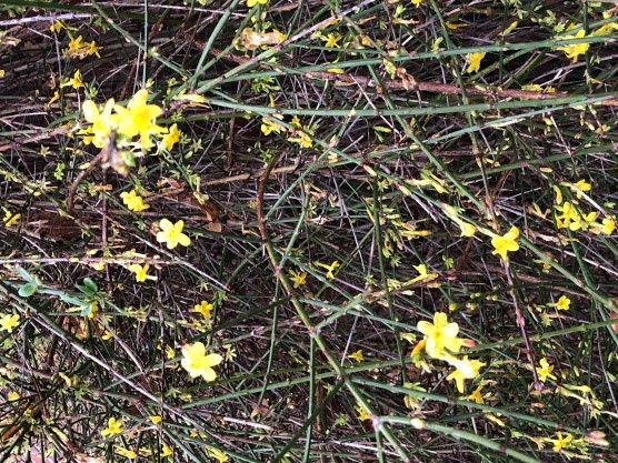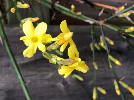 Eine andere zartgelb blühende Pflanze ist der Winterjasmin (Jasminum nudiflorum), ein kletternder Kleinstrauch, der von Dezember/Januar bis in den März blüht. Die Blüte erinnert an eine Forsythie. Er wird 2 bis 3 m hoch und eignet sich besonders als Wandbegrünung in sonniger bis halbschattiger Lage. Er ist ebenso wie die Zaubernuss bienenfreundlich und eine der ersten Trachtpflanzen.