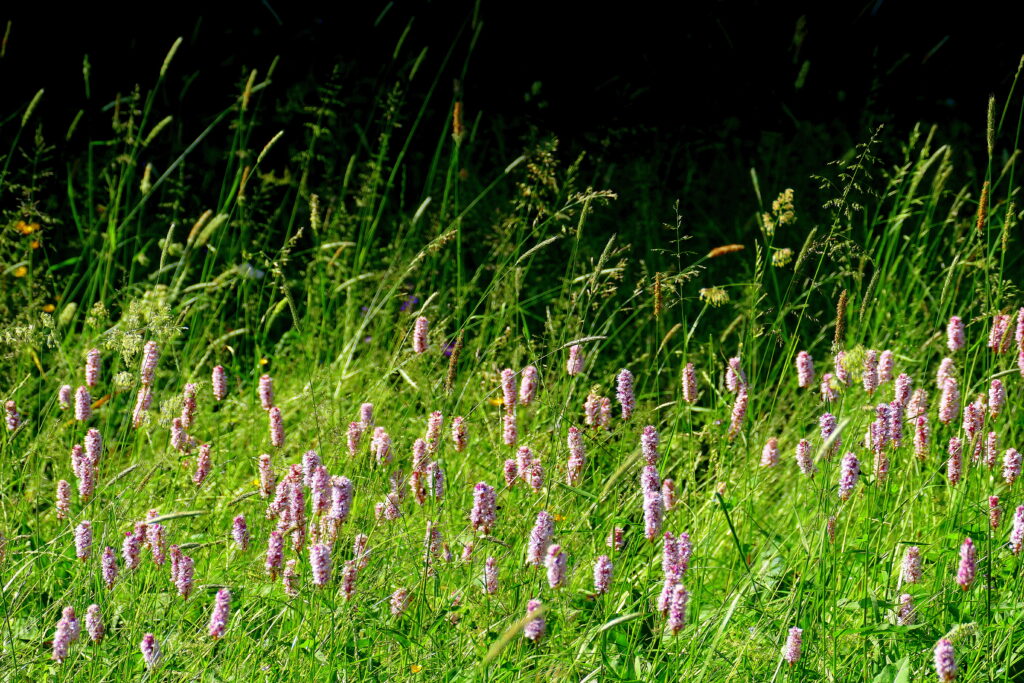 Ich konnte es kaum glauben, jede Menge Wildblumen. Ein Wunsch wurde wahr. Blüten, auch solche, die es auch gern etwas feuchter mögen. Kuckuckslichtnelken, Klappertopf (jede Menge), Wiesenknöterich, Wollgräser, Margariten, verschiedene Disteln, Ackerwitwenblume, Beinwell und ganz viele lila Orchideen. Was würde ein Gärtner dafür geben, wenn es ihm gelänge, eine Blumenwiese so anzulegen.-