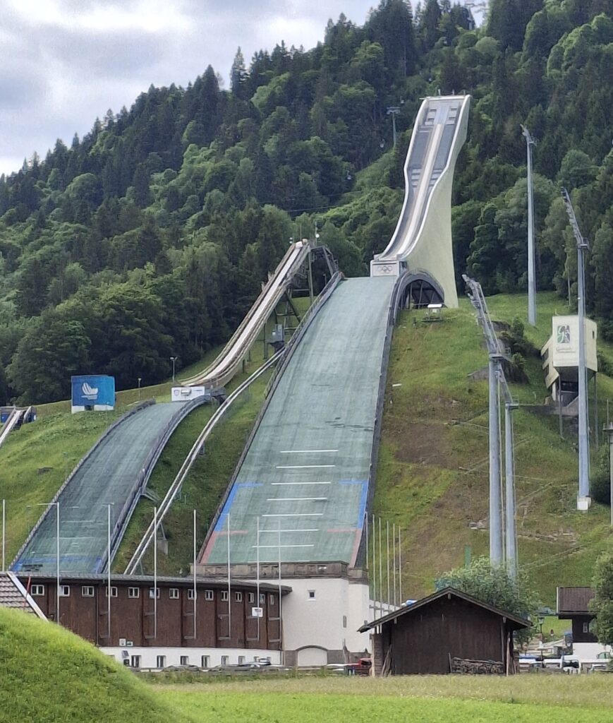 Hier im Olympia-Zentrum wurden 1936 die Winterspiele ausgetragen.1935 wurde das zum Anlass genommen, die Nachbargemeinden Garmisch und Partenkirchen zu vereinen.