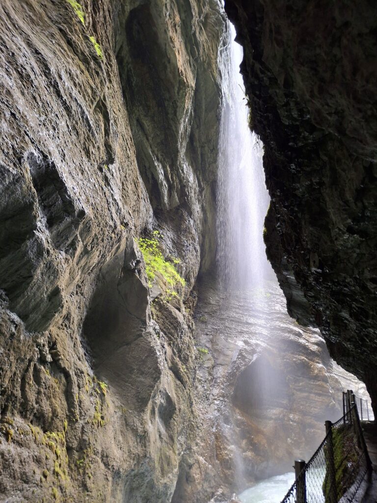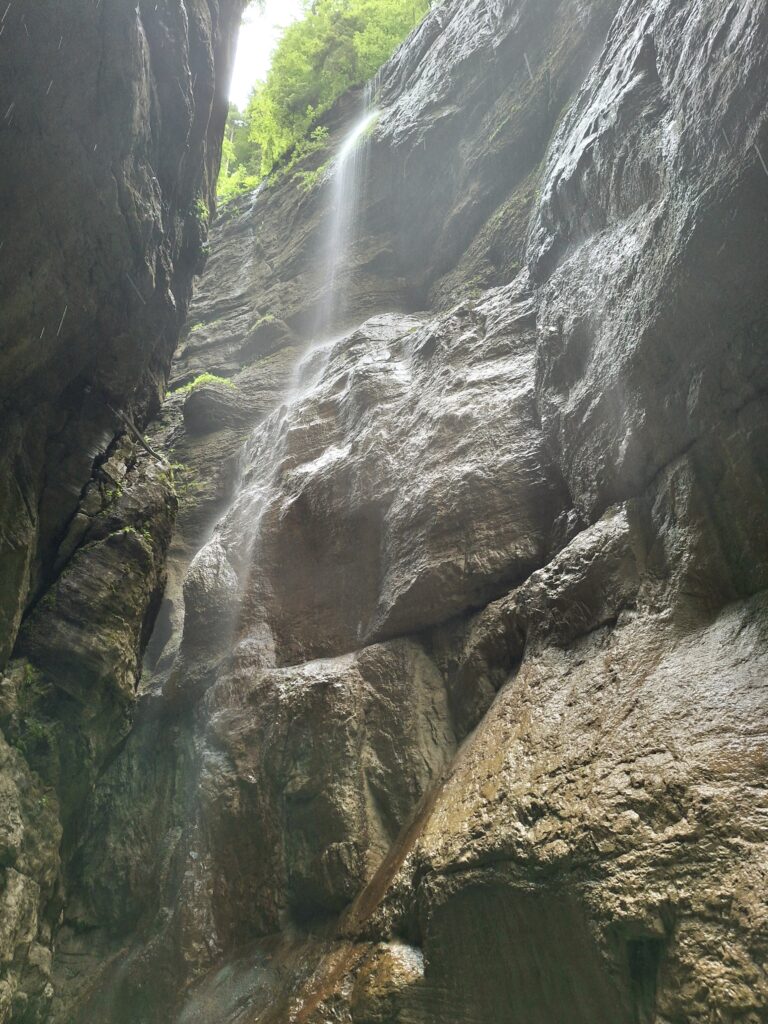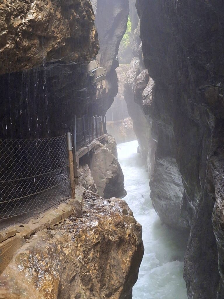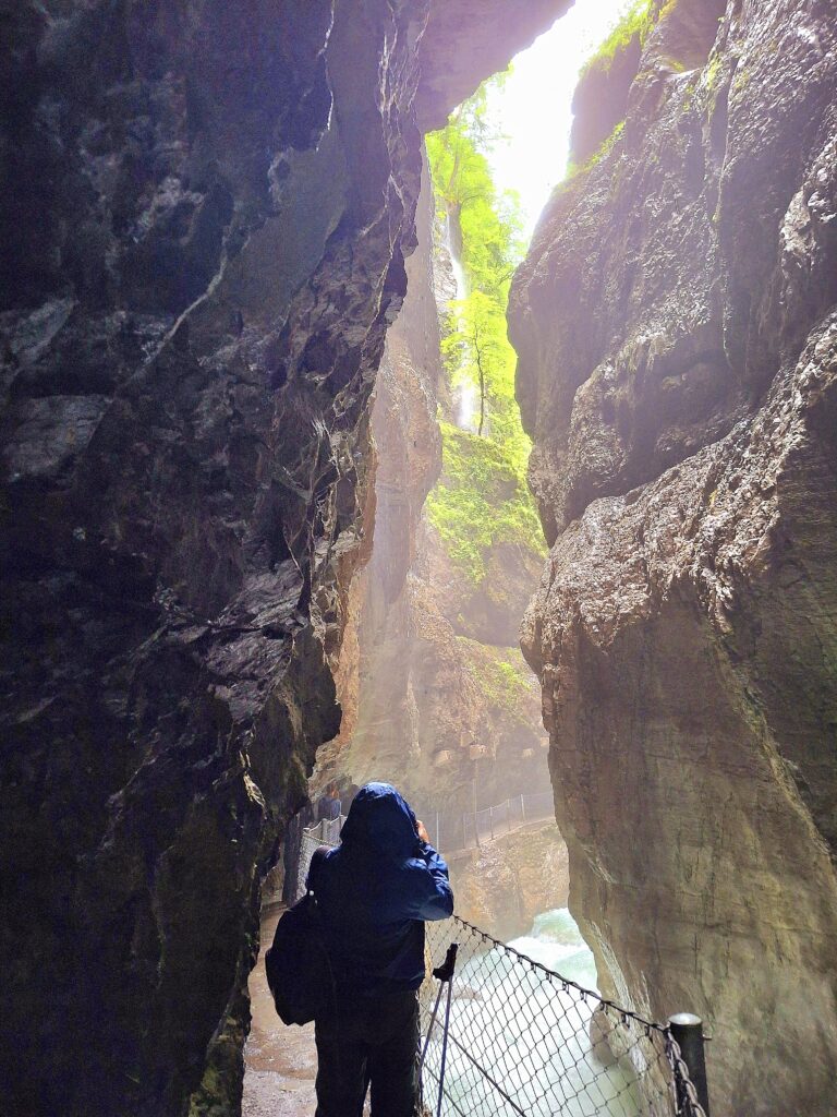 Die Nässe des zerstäubenden Wassers der Partnach, das auch von den Wänden tropfte, die Wasserfälle, schon bald war ich nass, wie ein „begossener Pudel“. Der Schirm war beim Fotografieren hinderlich und verschwand wieder im Rucksack.